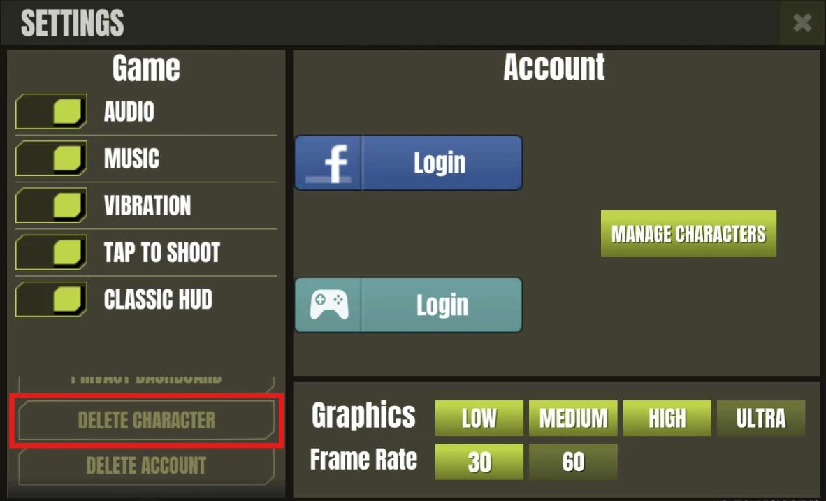 - In the bottom left corner, scroll down to find the Delete Character option.